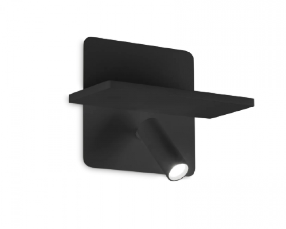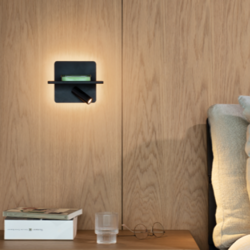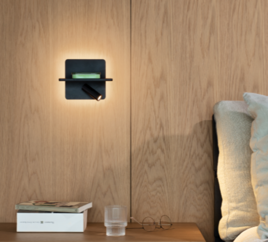 Total powder painted aluminium frame. OPALE polycarbonate diffuser with emission on the back. Adjustable frontal projector. Colours: Black
