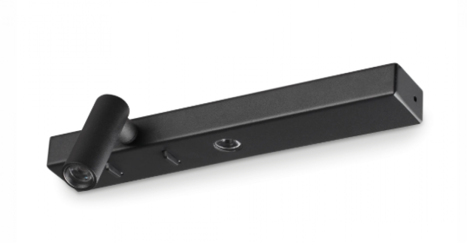Plated or powder coated metal frame. Double light source: one is fixed and the other is positioned on an adjustable cylinder. Two integrated switches for separate ignitions. Colour: Black.