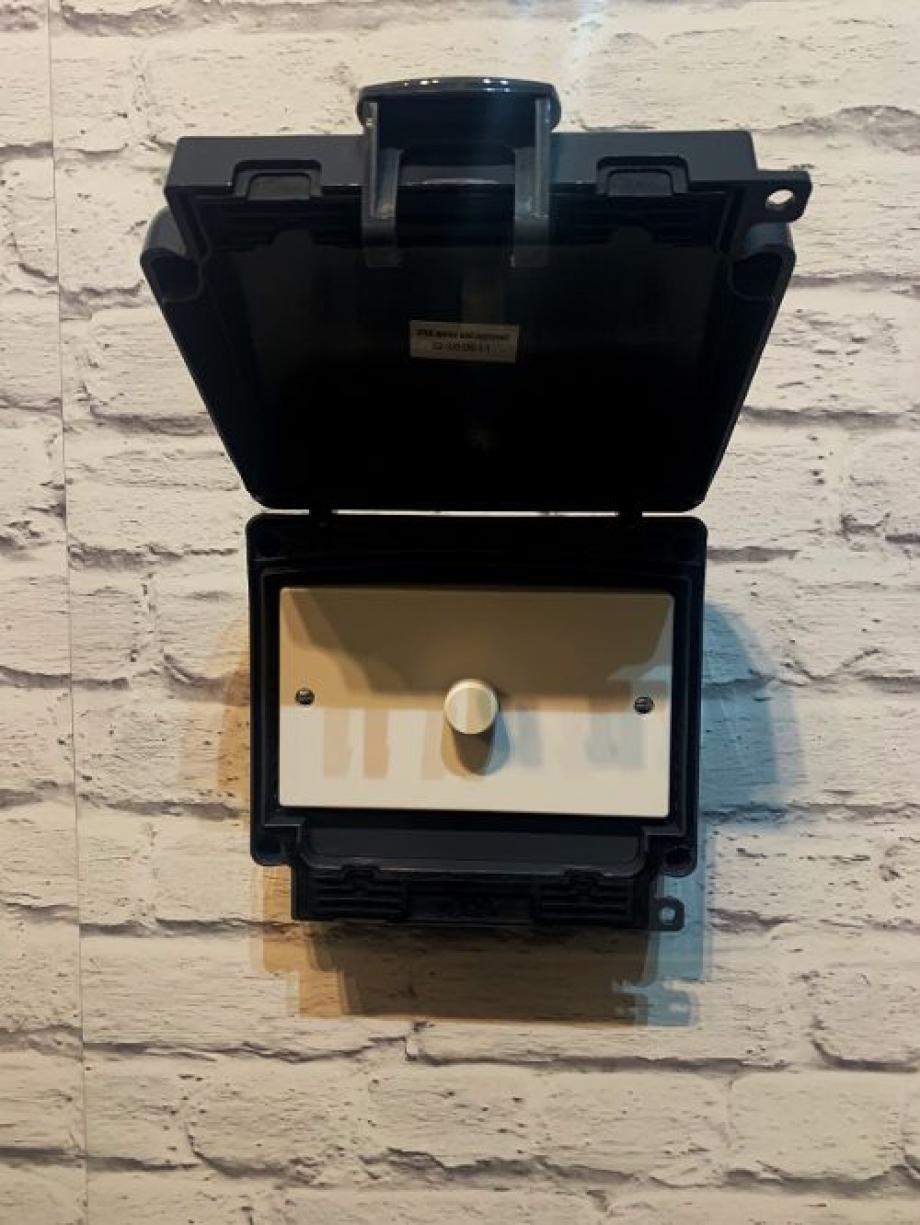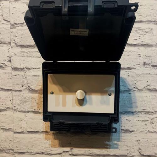 Outdoor 600watt LED dimmer switch 50 x LED lamps. This is a trailing edge V-Com dimmer rated at 600 watts, this means you can dim 50 x LED lamps in one run. Making it ideal for longer festoon lighting kits. The dimmer takes up a double plate so we have fitted this into a 2G anthracite grey IP66 weatherproof enclosure. This can be fitted onto any external wall and be left outside. The outdoor enclosure has a fixing clip and simple hinge lid so you can easily access the dimmer when you need it.
