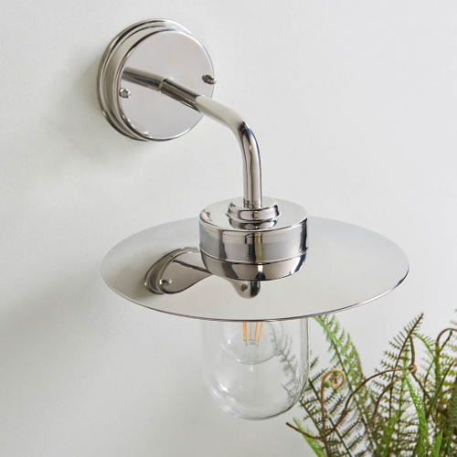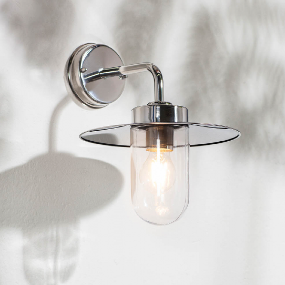A modern take on a classic exterior wall light, with a nod to nautical fisherman's lanterns, finished in polished stainless steel with clear glass shade. Pair with filament LED lamps to create a timeless authentic look.