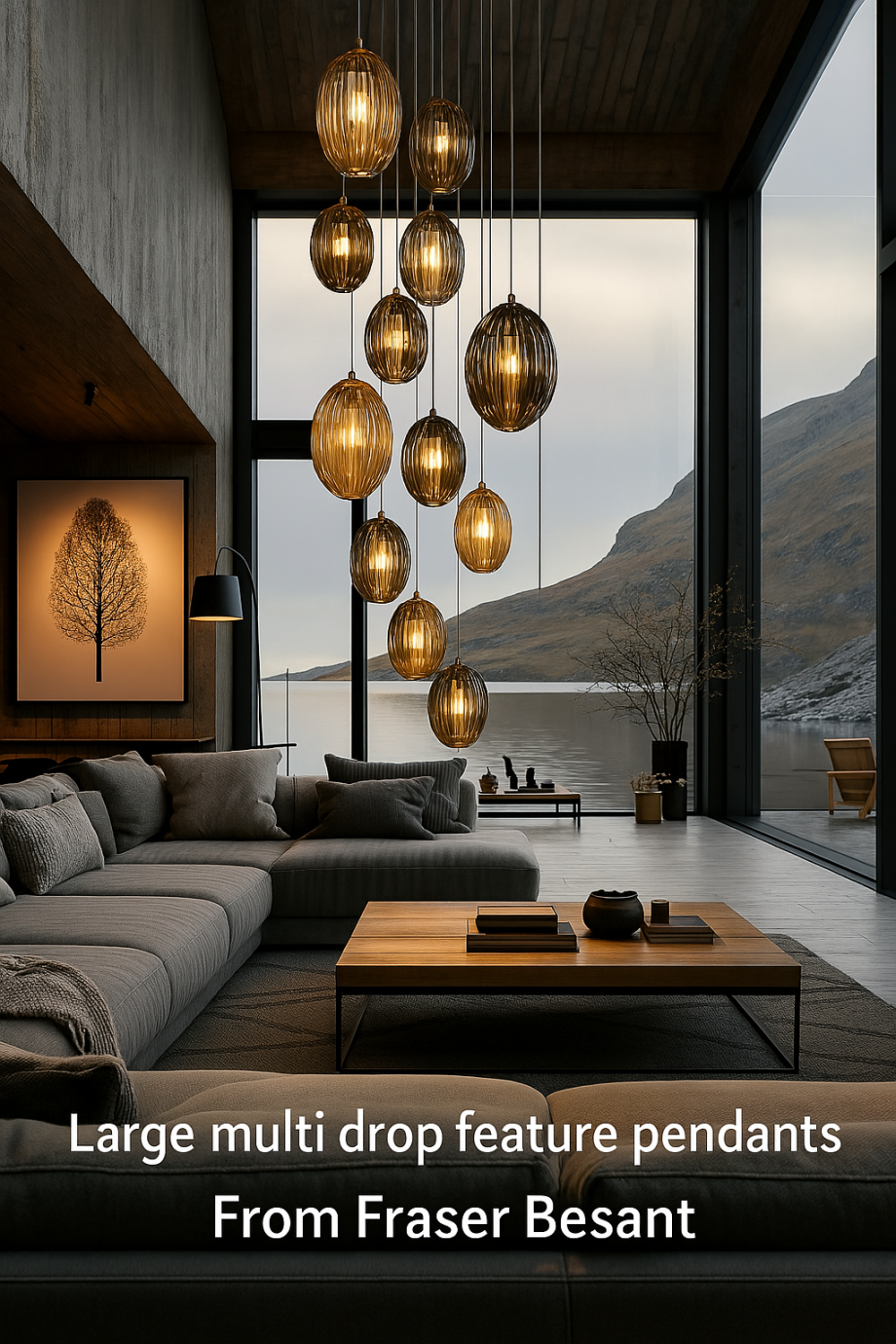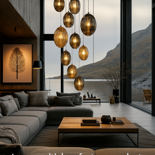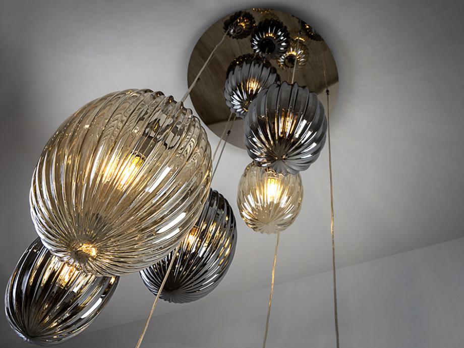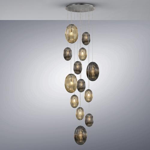 Schuller Ovila 13 light Chrome Pendant with Cognac and Smoked Grey glass shades 13 lights, made of a metal chrome finish. Combined glass shades: small and large size. Two shimmered glass colours: Cognac and Smoked grey. Dimensions: Height 3500mm x Diameter 960mm Includes 13 x E27 8w 870 lumen Dimmable LED lamps Comes with remote control for dimming