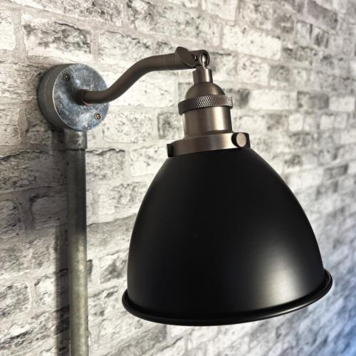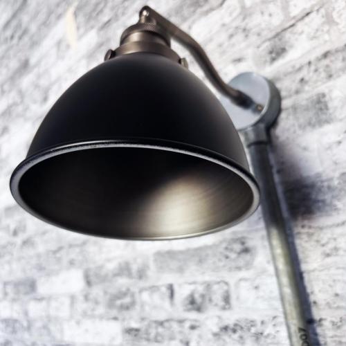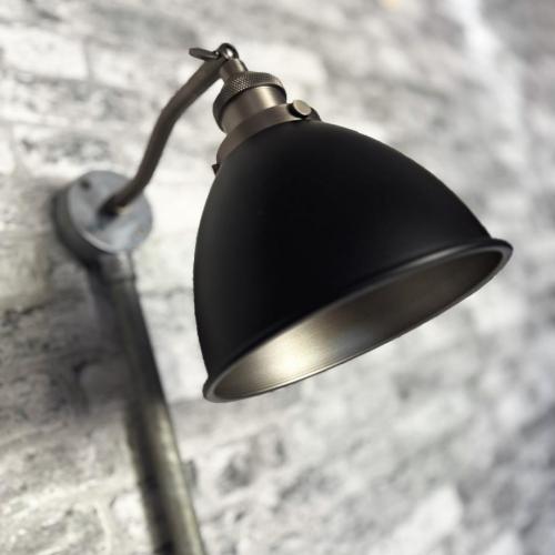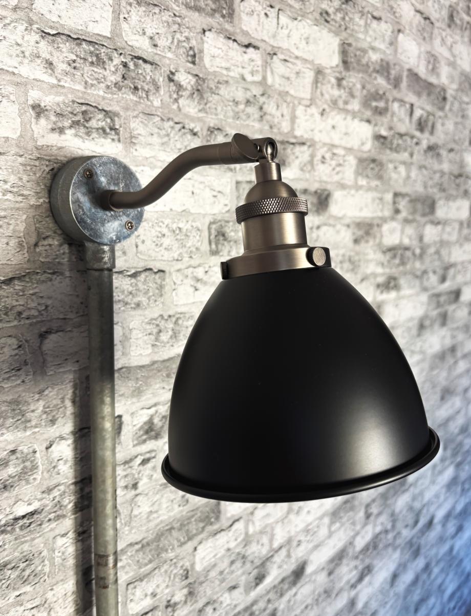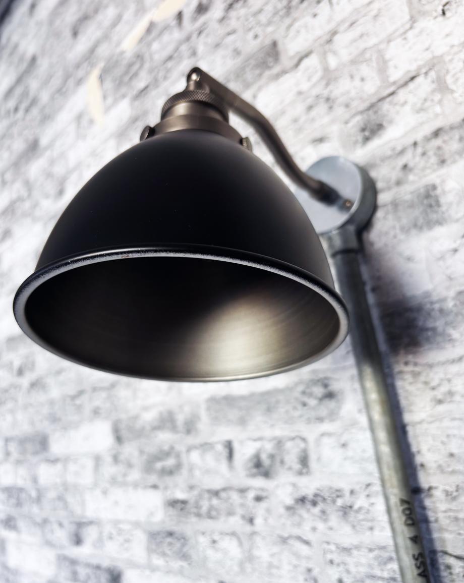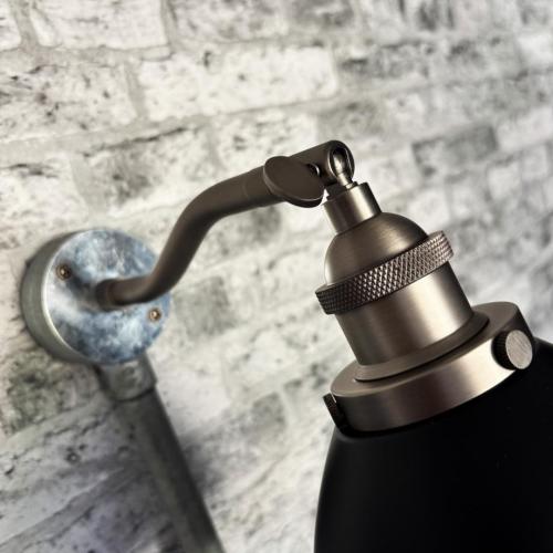 Oxford handmade conduit box light. A gorgeous matte black vowel shaped shade with a brushed nickel inside. Fitted to a 200mm matching nickel adjustable arm. Complimented with knurled metal detailing.