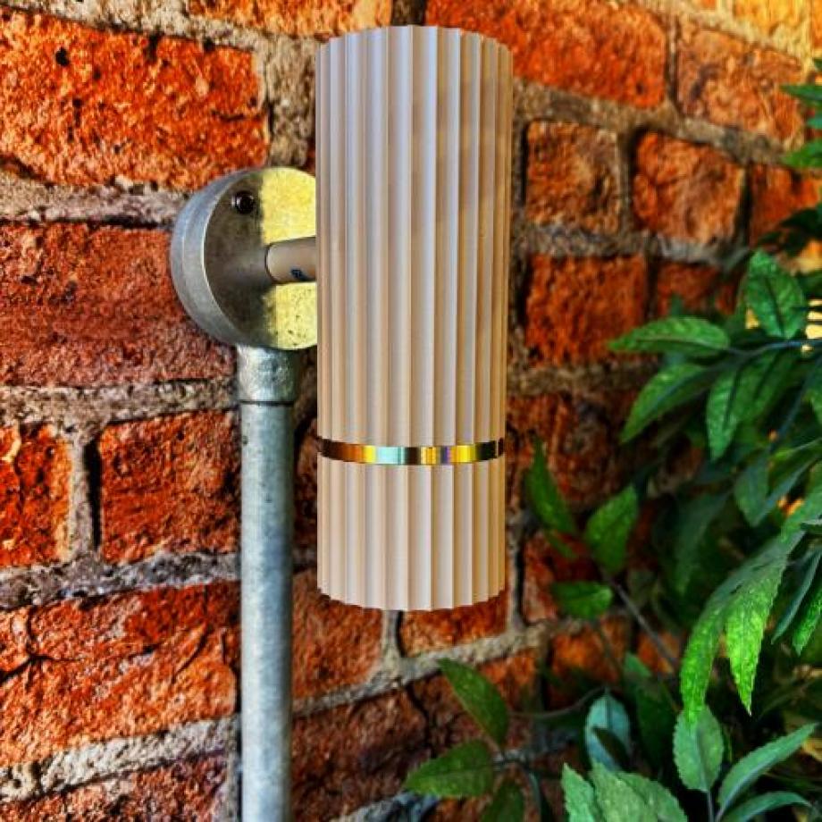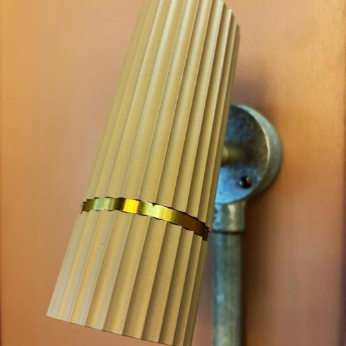 Pastel pink ribbed metal conduit GU10 spotlight. A fully adjustable handmade dusky pink and gold detail spotlight. Fitted to a conduit end box with a 20mm thread. A perfect feature wall wash lamp or ideal as a bedroom reading light. Retro meets industrial with this design.