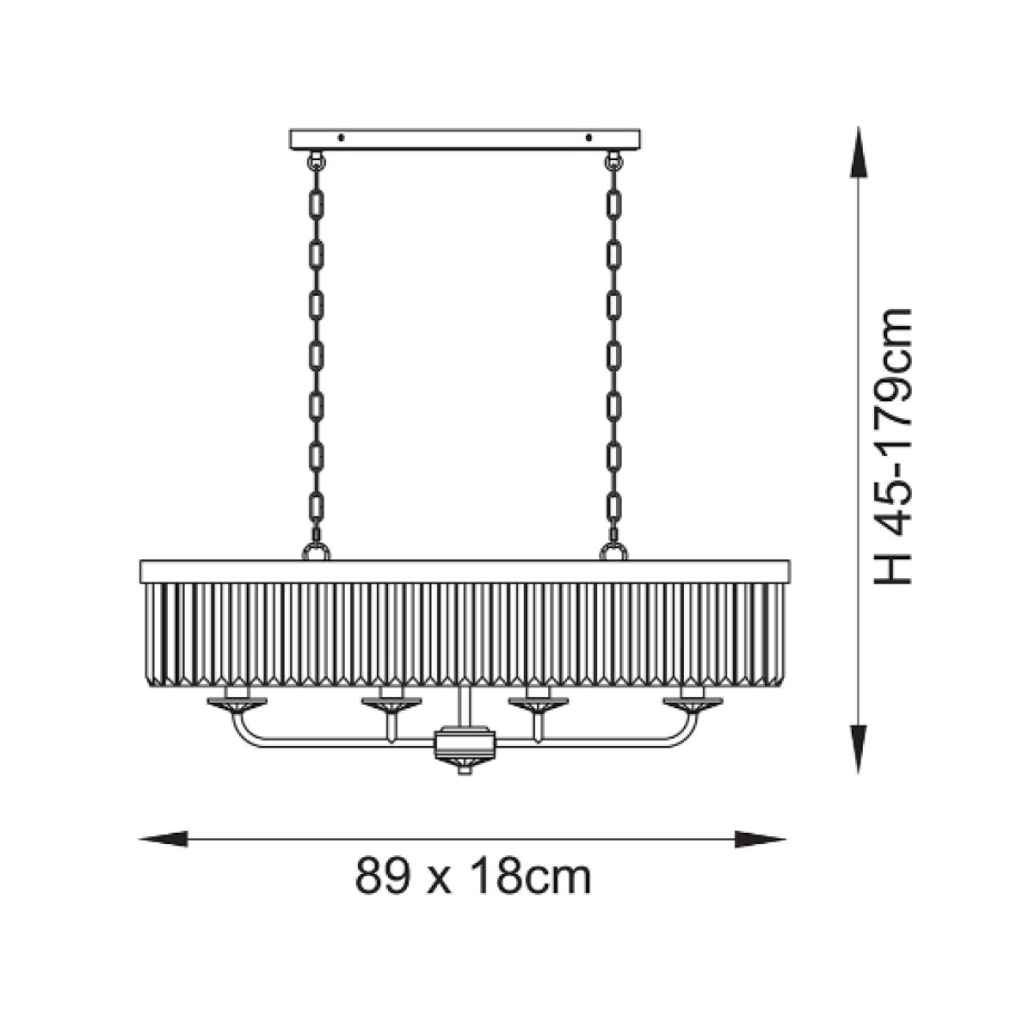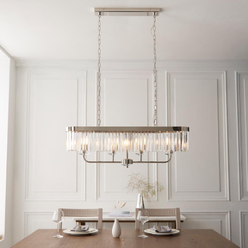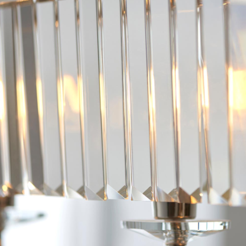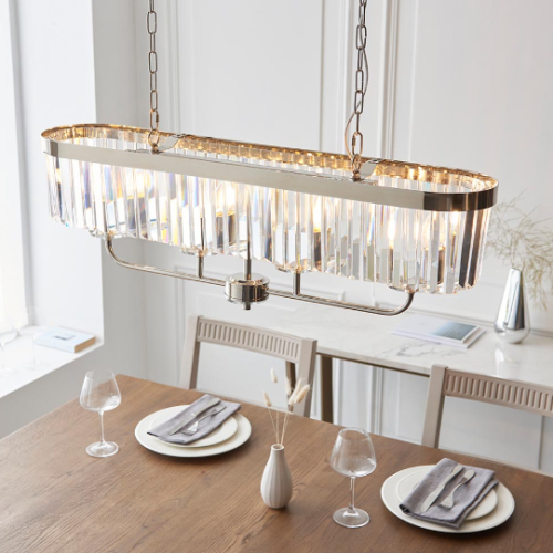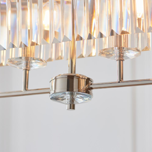 A design classic, this opulent linear pendant light works equally well in contemporary or classic interiors. This timeless bright nickel plate chandelier is surrounded by faceted clear glass which creates striking light patterns.