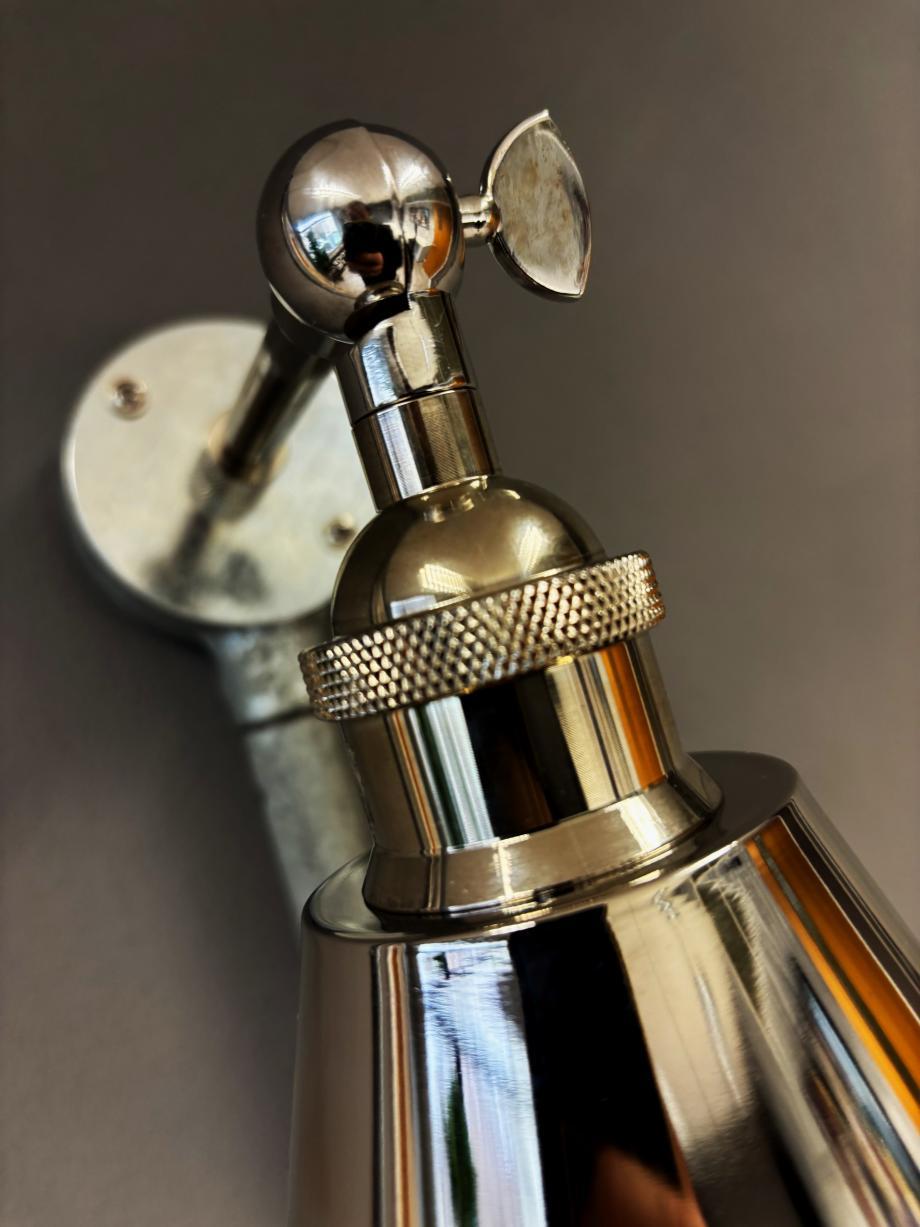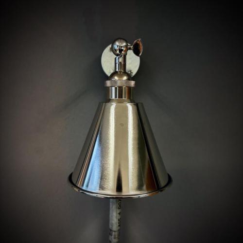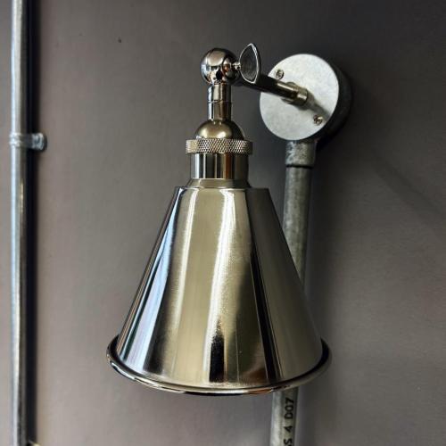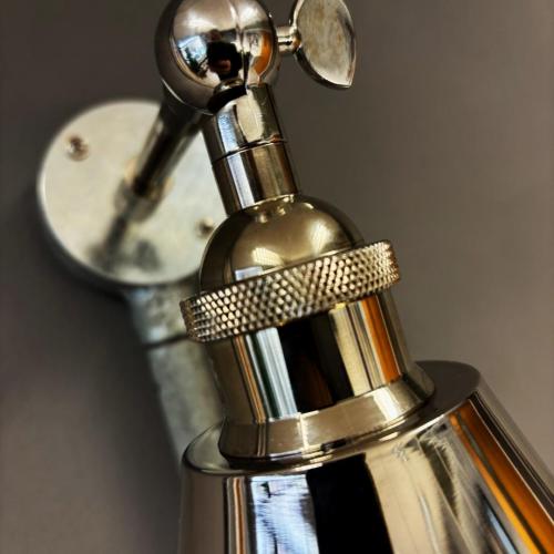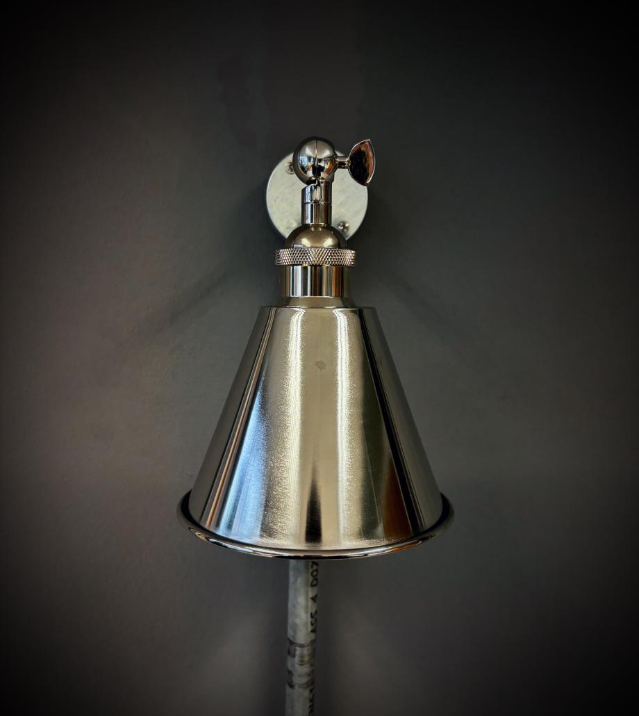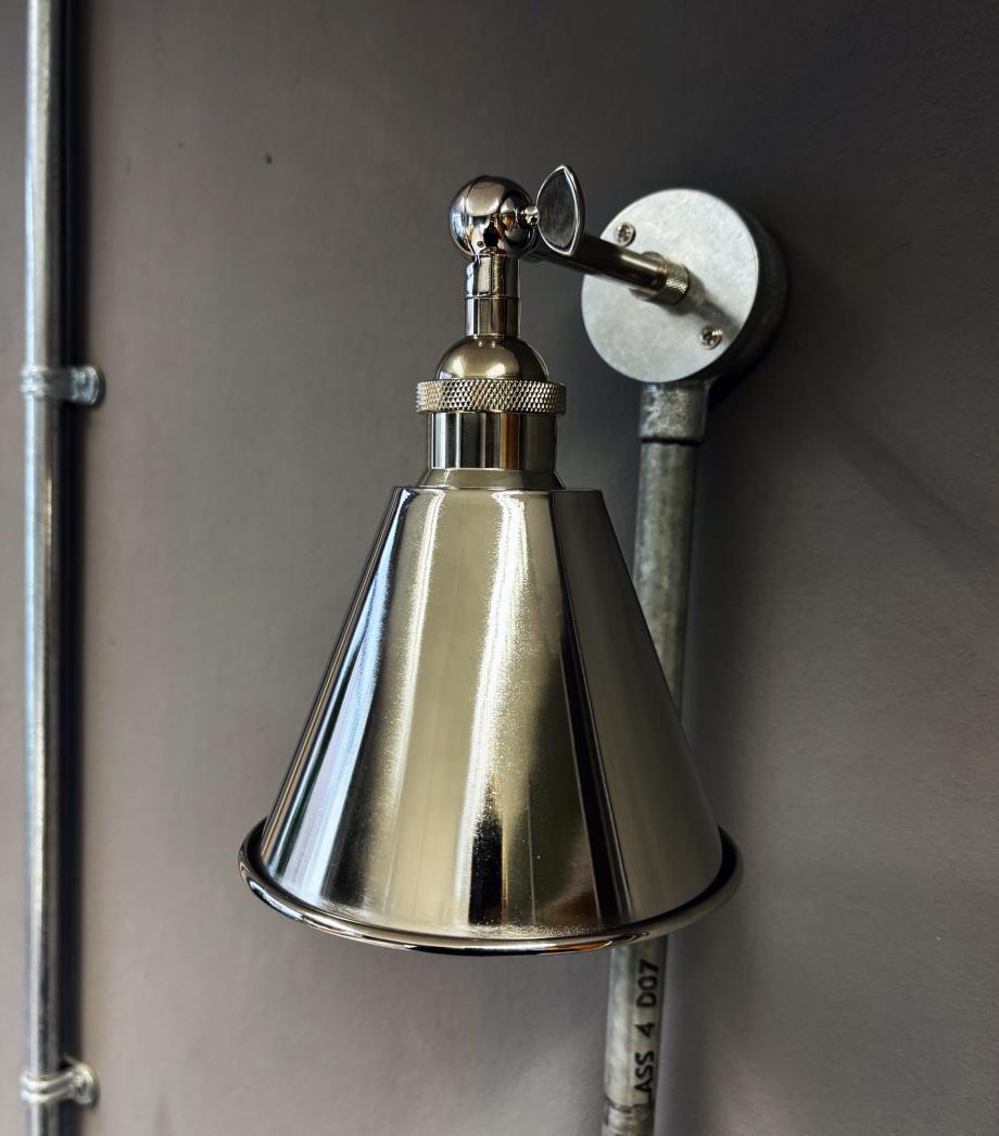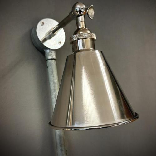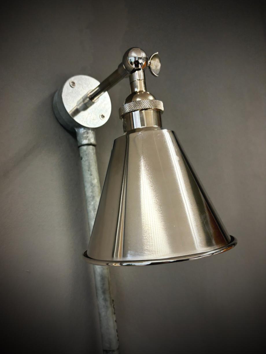 140mm wide polished nickel metal shade fitted to a lovely nickel arm. Projection 150mm. Complete with knurled diamond etched detailing on the lampholder and fixing arm. A stylish and modern adaption to an industrial light. Completely handmade in my Bristol workshop.