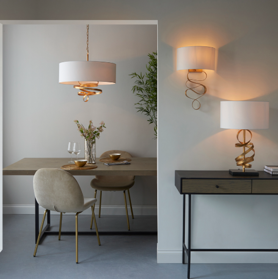 A twist on a classic drum shade pendant, this exquisite ceiling light brings a sense of tasteful luxury to any interior. Below this falls swirling curls of gold leaf ribbons that guide the eye towards whatever you might choose to position below. Combine with matching items from this range for an elegant coordinated look.