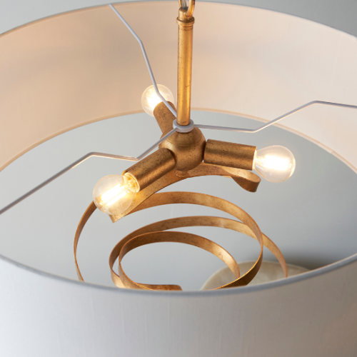 A twist on a classic drum shade pendant, this exquisite ceiling light brings a sense of tasteful luxury to any interior. Below this falls swirling curls of gold leaf ribbons that guide the eye towards whatever you might choose to position below.