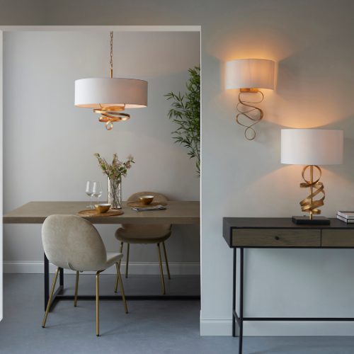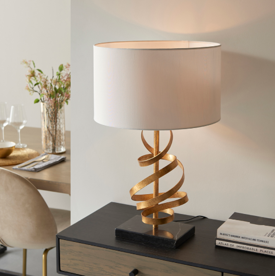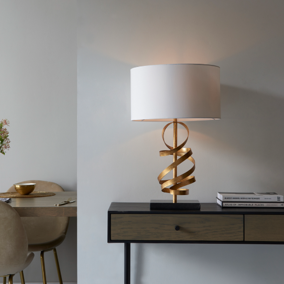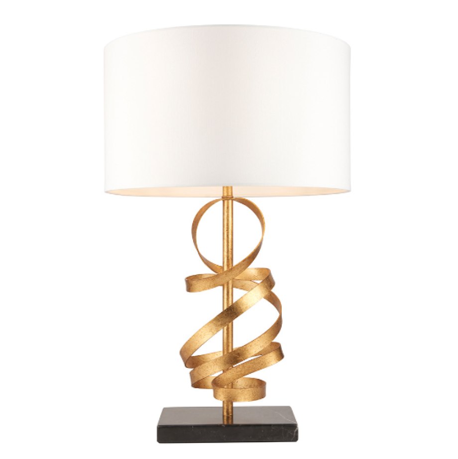 This designer table lamp features a textured, gold leaf stem with swirling curls of gold ribbon metalwork, finished with an ivory cotton shade. The black marble base grounds the table light, giving it a reassuring solidity. Combine with matching items from this range for an elegant coordinated look.