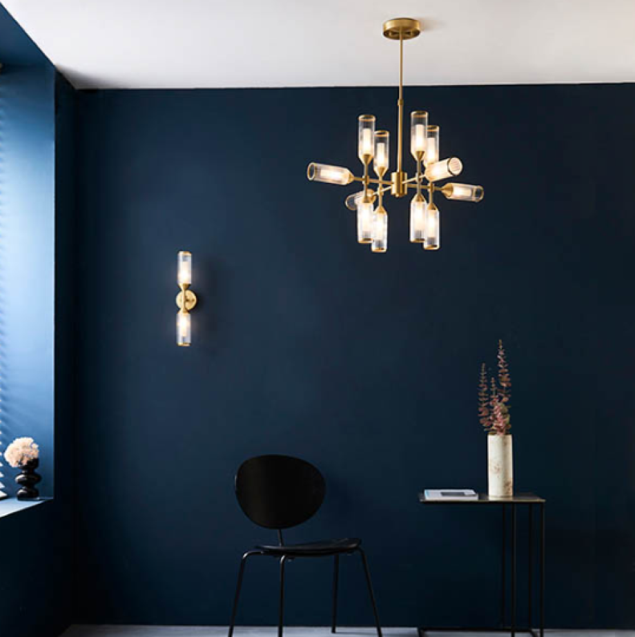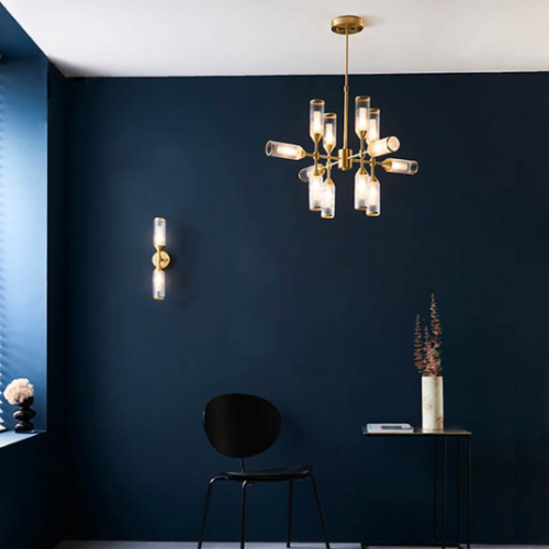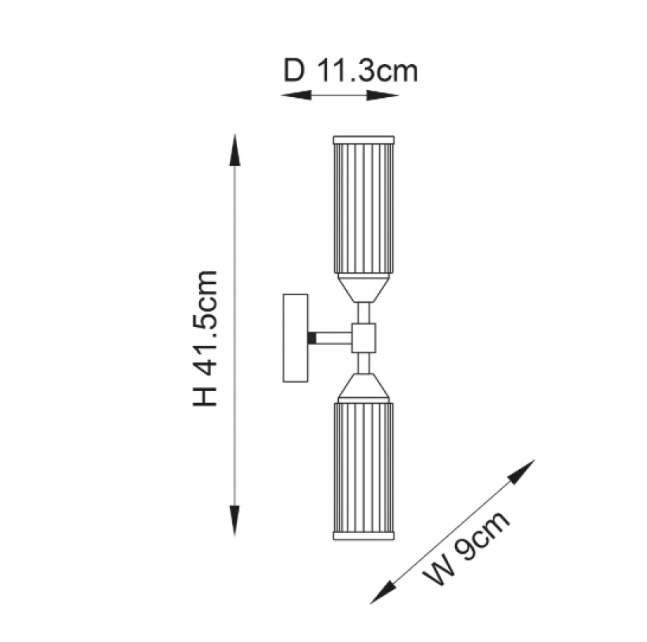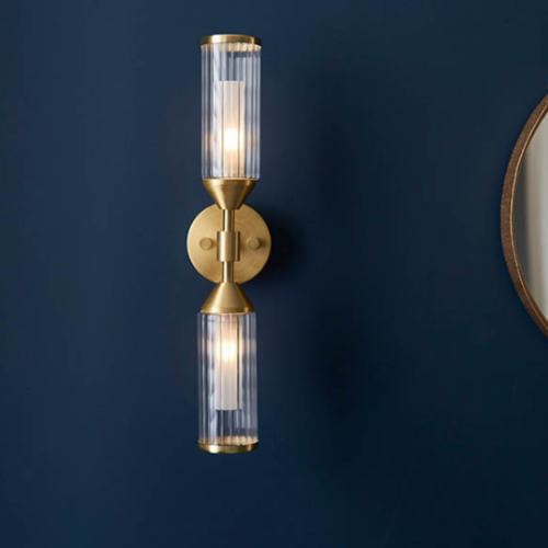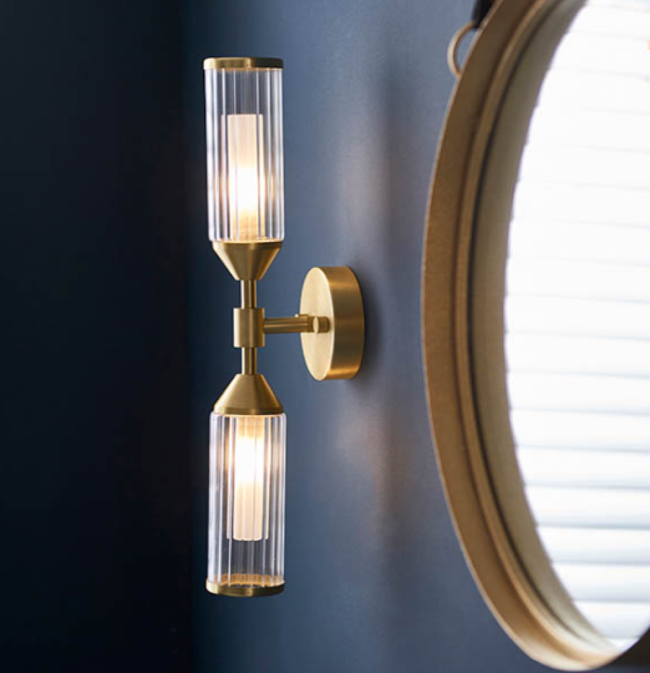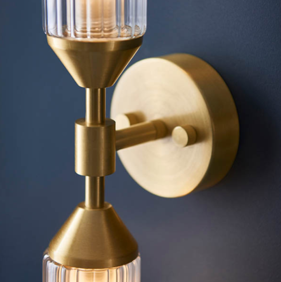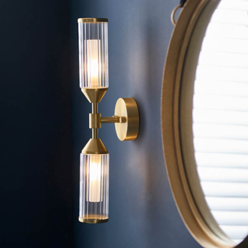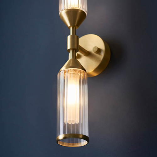Add some mid-century design to your interior with this double wall light in satin brass. Featuring clear ribbed glass shades and a circular back plate. Combine with matching lights from the same range for a coordinated look.
