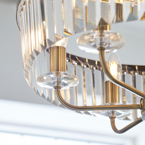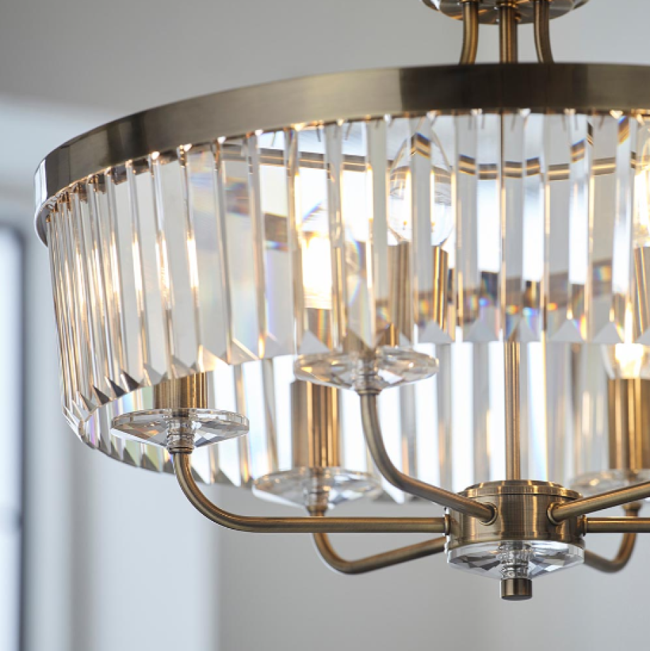 A design classic, this opulent pendant light works equally well in contemporary or classic interiors. This timeless antique brass plate chandelier is surrounded by faceted clear glass which creates striking light patterns.