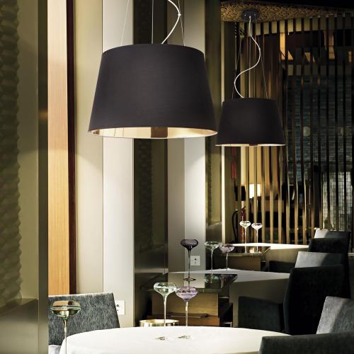 Royale midnight black and gold feature pendant set. A statement polished gold inner wrapped with a dark midnight black fabric measuring 600mm. This is both opulent and contemporary. I love the dark feel to this light and it would well in a modern dark and moody master bedroom suite with dark fabric bedding and curtains. I have used this exact pendant light on several of my lighting designs just over the bed and it works well. It is powerful and elegant and really stands out, while the shape and texture of the fabric are not too bold. Please allow up to 10 days for us to order these gorgeous lights in from Italy.