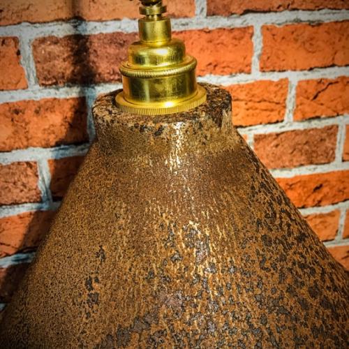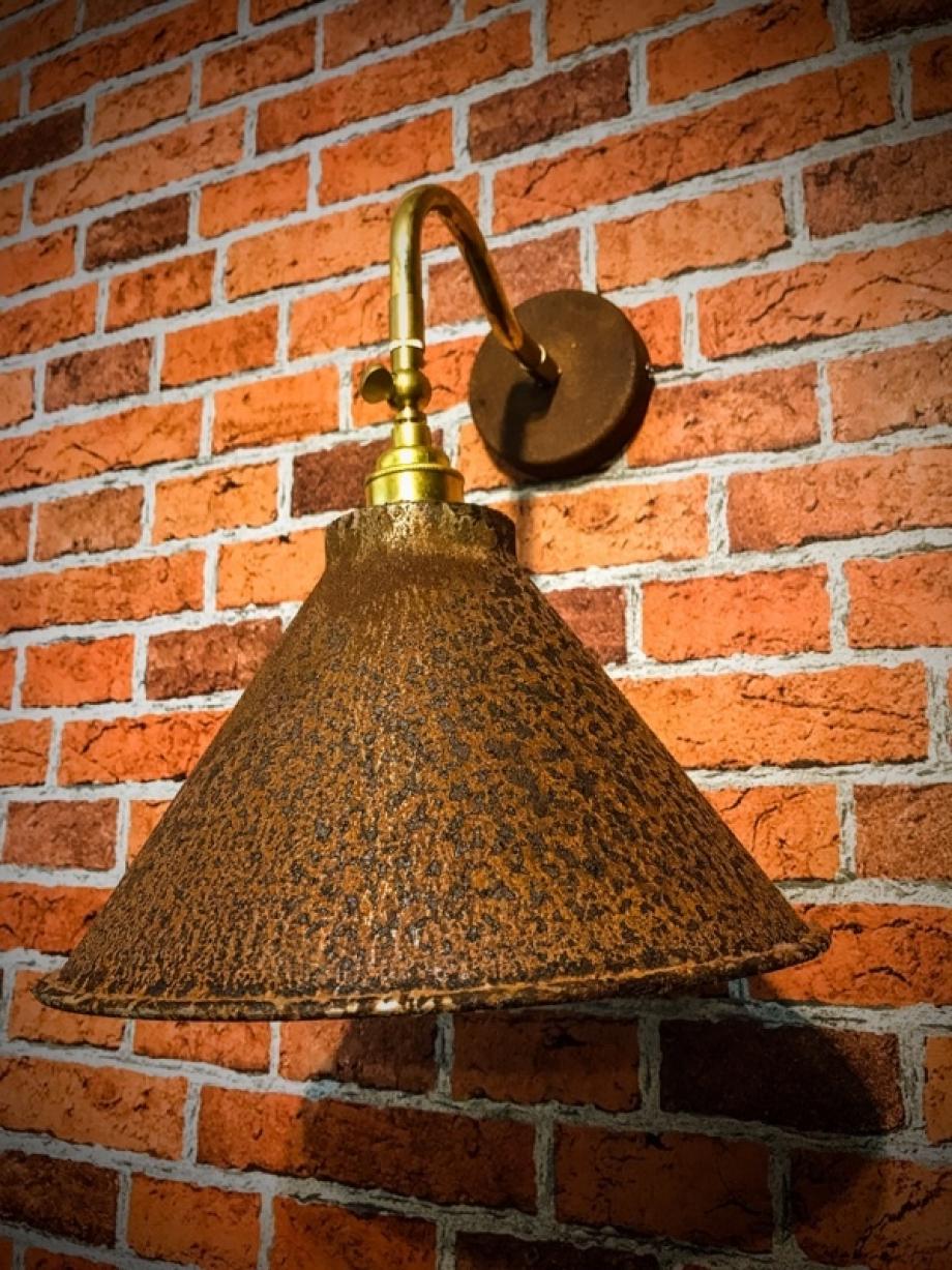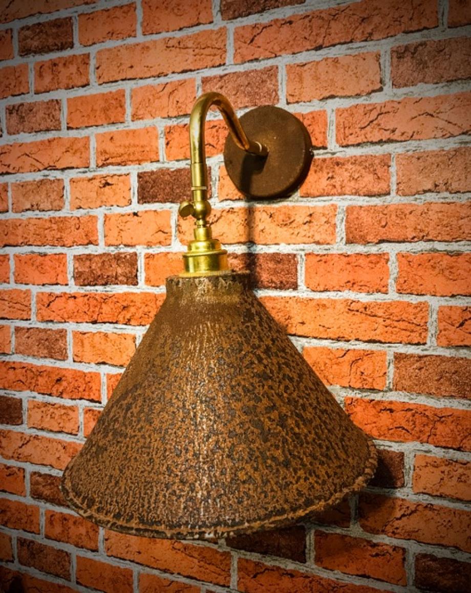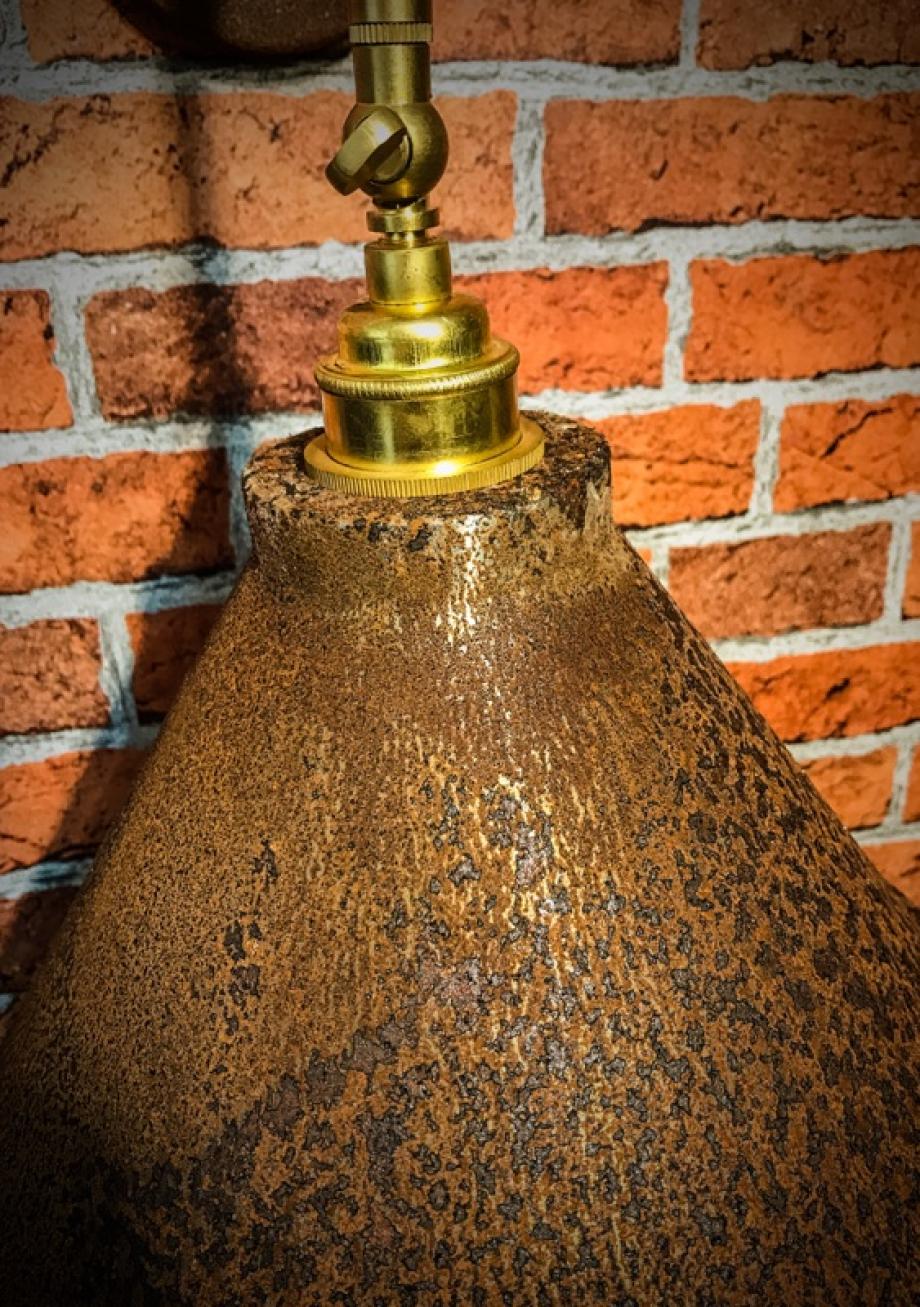 A simple yet elegant swan neck wall light, rusted metal with a brushed brass swan neck arm and fixing joint. This is a simple and effective design and the textured rusted metal and brass finish really complement each other. The lampshade is hand made in the UK from 1.5mm thick steel, it is 260mm wide. We age the metal in our workshop and once the golden rust has taken to the metal we then hand lacquer the shade to seal the finish in. Each fitting is full of character and is slightly different. The fitting comes with a brass E27 lampholder which would suit either a decorative squirrel cage lamp or a brighter LED should the light fitting be required for primary lighting in a space. This fitting projects 300mm from the wall. It is made to order in our Bristol workshop so please allow up to 3 days for us to build and test you one. We design and build everything in Bristol and we take great pride in our workmanship.