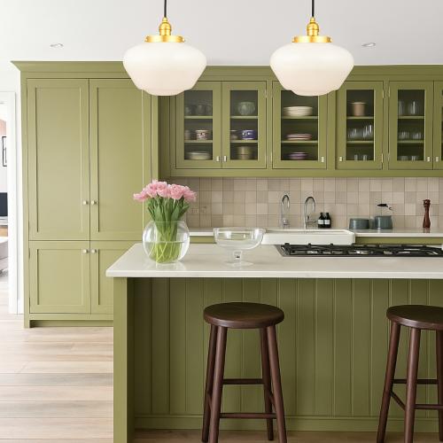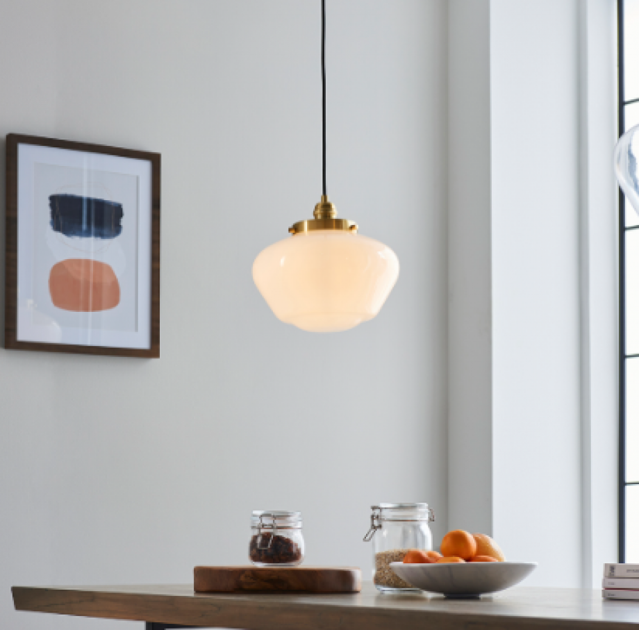A timeless “school house” styled pendant in brass with opal glass, ideal for the kitchen, above a breakfast bar or dining table. Hang individually or in a set of three. Matching semi flush also available.