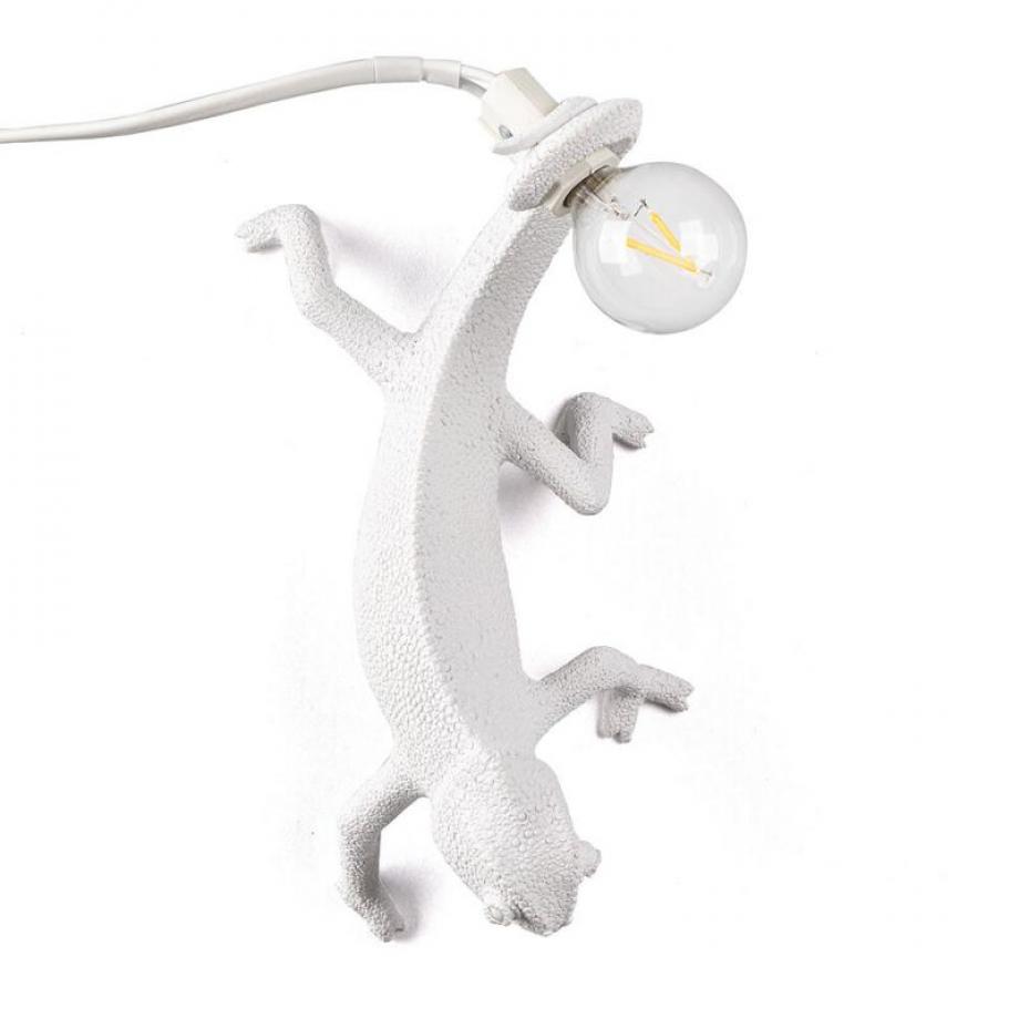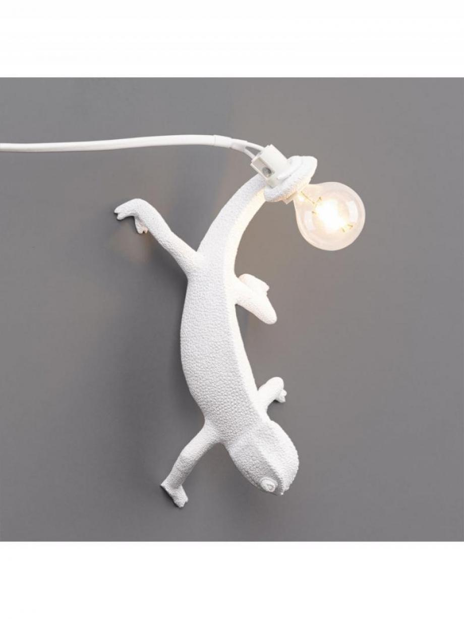 Designer Marcantonio Raimondi Malerba continues his naturalistic exploration with this amazing Chameleon table lamp. This stunning lamp, casual and extroverted, is the perfect decoration for camouflage and cocky houses, which don't fear prying eyes. Cast from white resin, these kooky chameleons project their colourful personality into your space, each with it's tail coiled around a warm white bulb. Available in three styles, right (down) and left (up) are wall lights, whilst the still chameleon is a table lamp, each striking a pose with feet poised in an easily recognisable stance.The beautiful fittings are supplied in a decorative presentation box with the LED lamp.