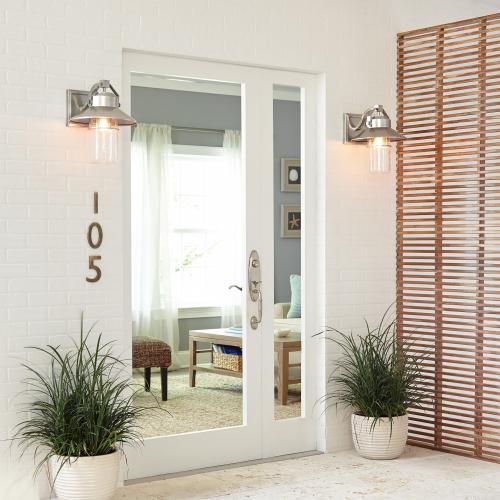 Station IP44 brushed nickel outdoor wall light. Made using the finest weather resistant metals and materials. Making this an ideal light for coastal areas, if you live within 5 miles of the sea then this light is the perfect choice. It is beautifully crafted and comes with a full 5 year guarantee. There is a slight seeding on the glass cover but you can still enjoy the use of a decorative filament LED lamp. Each light is 390mm and 316mm wide so they really make a statement on or off. I have recommended this exact light on modern beach house and sleek contemporary barn conversions. They are well made and look gorgeous.
