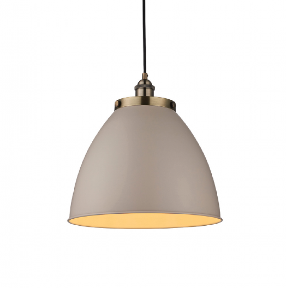 An authentic 'resto' style industrial pendant, finished in vintage stone colour paint with antiqued brass plated details. Suspended from height adjustable black fabric flex, pair with filament LED lamps for that perfect industrial style. The perfect addition for today's stylish homes to create that on trend bar, bistro look.