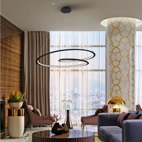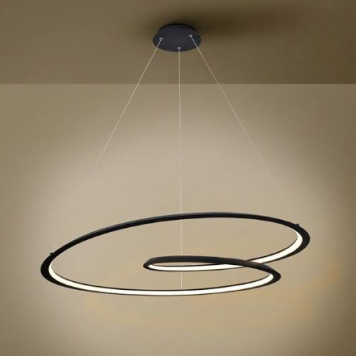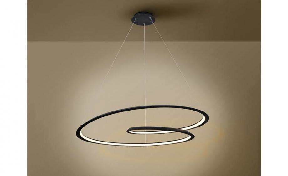 For a glamourous but minimalistic light the swirl effect LED pendant is a great choice. Its charming and elegant modern design makes this an attractive light fitting on or off. The large-sized pendant is supported by a circular ceiling plate and has an impressive maximum drop of 130cm. Its looped design twists into an attractive shape while its matt black finish suits a range of modern decor styles. Running along the inside edge of the loop is an opal silicone diffuser softening warm white LED light. This elegant pendant is perfectly suited to homes with modern interiors and looks fantastic in bedrooms hallways and living rooms. A medium size is also available.