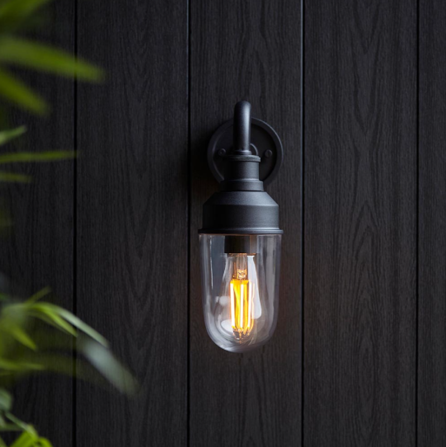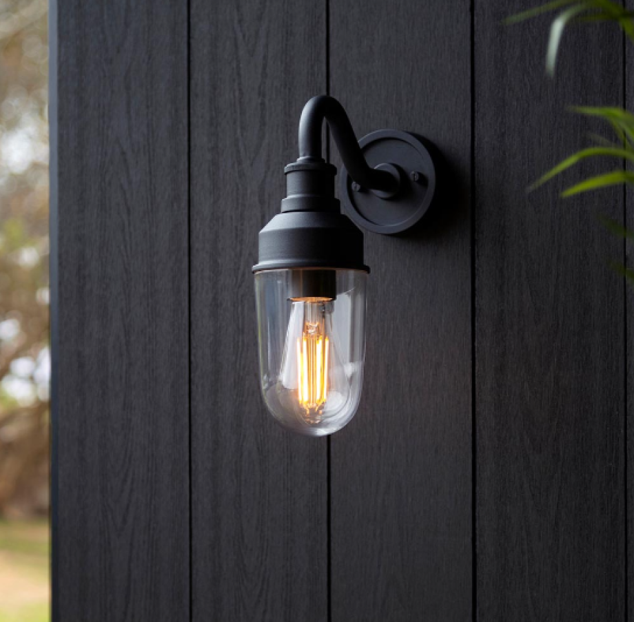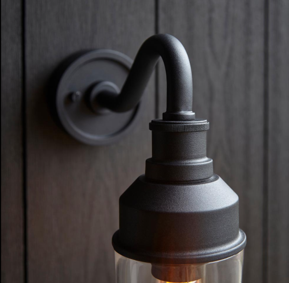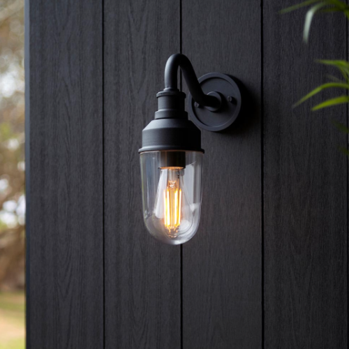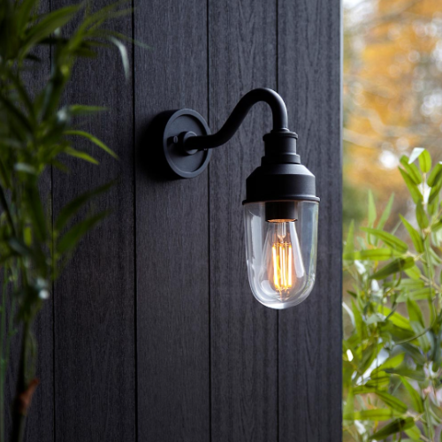 Die cast aluminium curved arm wall light in matt black finish- perfect for classic, vintage and modern styling. Designed for use in both exterior locations and bathrooms.