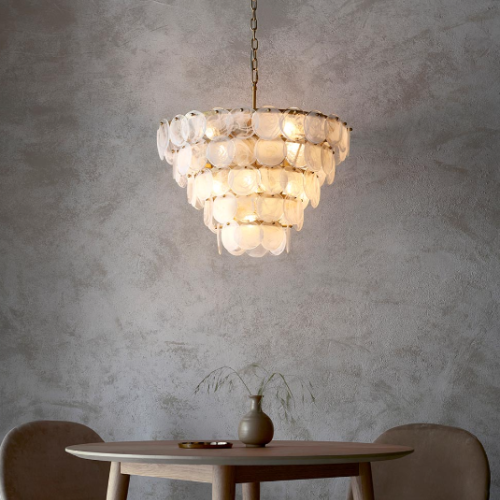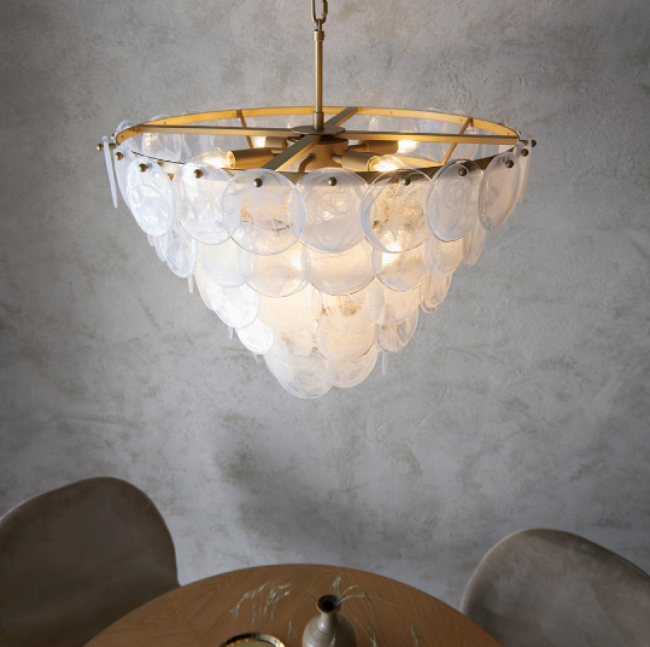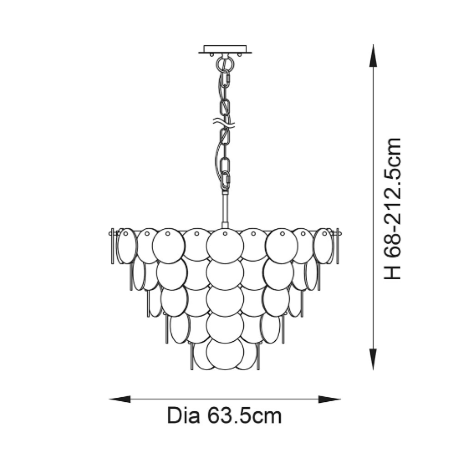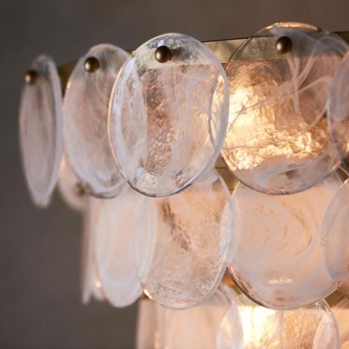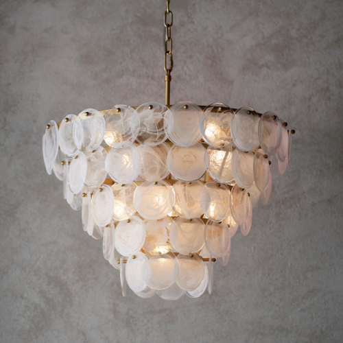 Tiered antique brass and glass disc chandelier light. Create an ethereal presence with this exquisite chandelier featuring tiered layers of stunning swirled glass discs. With an adjustable, antique gold chain and nine dimmable lights, this striking centrepiece is the perfect finishing touch.