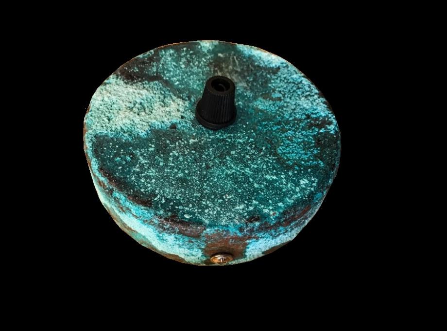 A beautiful hand finished verdigris copper ceiling rose. To create this natural aged effect takes several days to break thesolid copper finish down, once the patina/verdigris has set in we then lacquer the rose by hand to seal the finish. This is a very unique and beautiful patina finish and each one we make is unique. They each verdigris slightly differently and this adds to the character of the finished lighting design. The end result is a textured raw industrial rustic copper that is very eyecatching. I also offer verdigris copper lampholders if you want to make up a pendant light. I have a large choice of fabric lighting cable to choose from and designer decoartive LED lamps. I can even wire and test it all up for you in my workshop and send you a finished pendant. I offer these ceiling roses with 1-7 outlets. To discuss a bespoke pendant or lighting design please email me info@fraserbesantlighting.co.uk I am always happy to talk lighting and I am very passionate about my work.