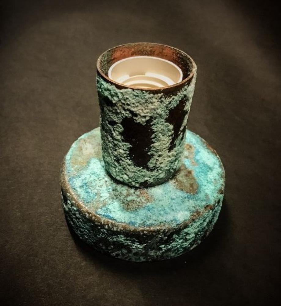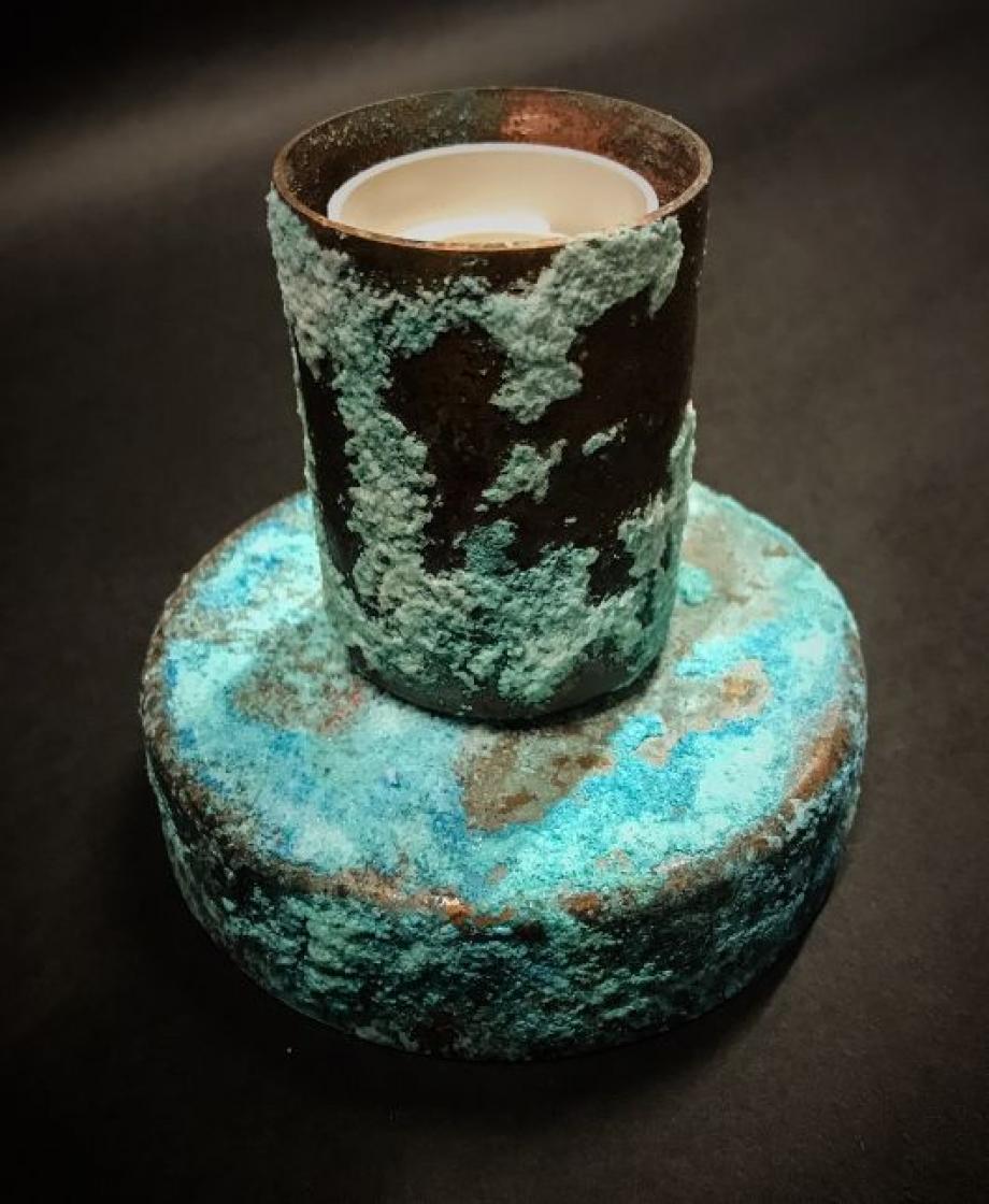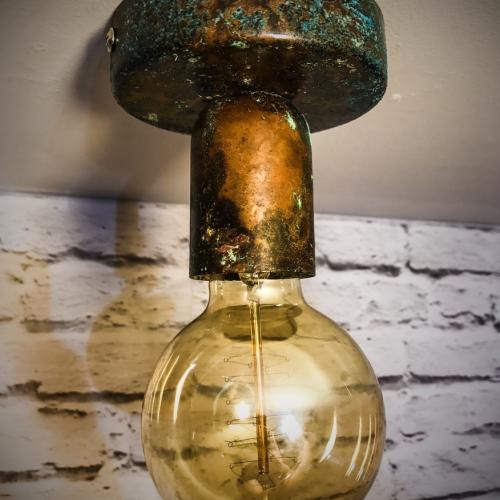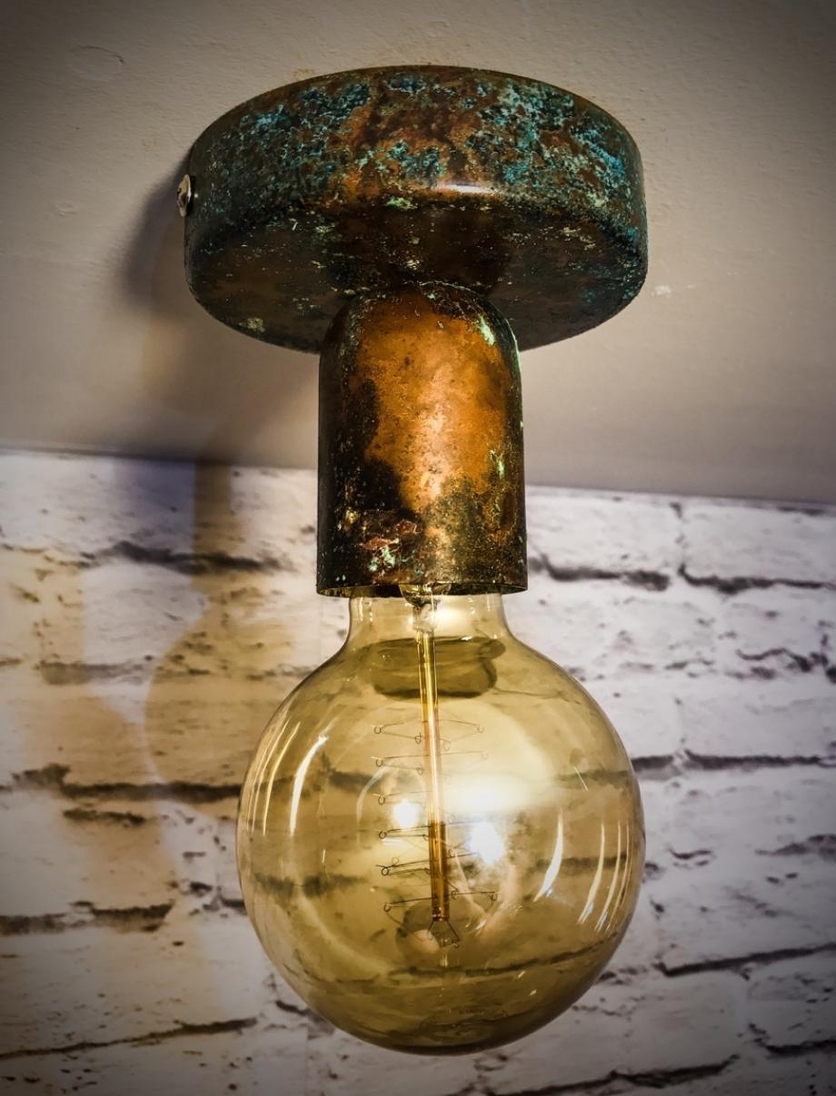 A handmade verdigris rustic copper baton holder light. Ideal for use as a wall light, or in a loft or basement when the ceiling height may not be great. The overall height of this fitting with a decorative light bulb included is only 170mm. To create this natural aged effect takes several days to break the solid copper finish down, once the patina has set in we then lacquer the holder and fixing plate by hand to seal the finish. This is a very unique and beautiful verdigris patina finish and each one we make is slightly different. They each age slightly differently and this adds to the character of the finished lighting design. I offer other lights in Verdigris copper including pendant lighting and downlights. The distressed textured finish of the verdigris makes these lights a great talking point and they are certainly a statement. They are popular in barn conversions and rustic country homes also in industrial and vintage bars and restaurants.