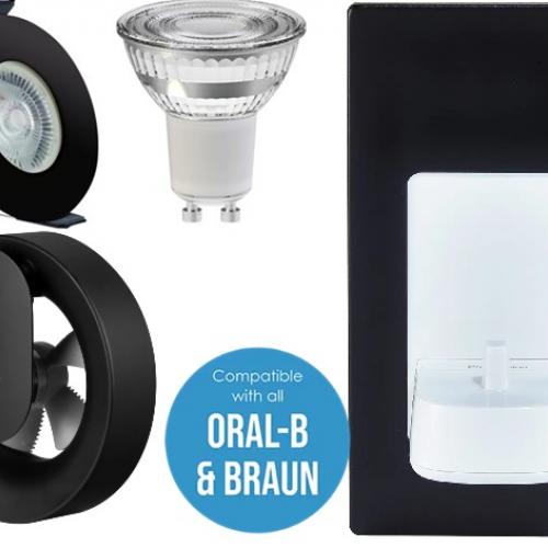 Black Bathroom Accessory Bundle comprising of a Proofvision Toothbrush Charger with Black frame, a Black Vent axia Svara Extractor fan and 4 x Integral evofire Matt black downlights with cool white non dimmable LED GU10 Lamps. Make a great saving on this trade bundle package.