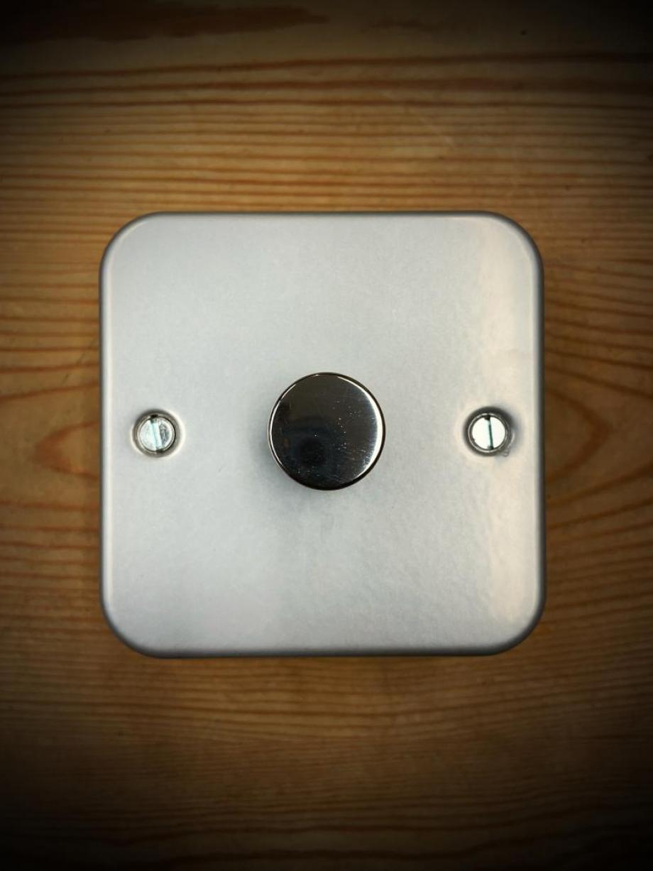Metal clad 1g LED dimmer with chrome etched dimmer knob. Each handmade dimmer comes with a surface metal clad single box and a fitted with a Varilight V-pro trailing edge dimmer. The dimmer is rated from 0-120watts so will dim 10 LED lamps. This style of dimmer would work well with any industrial lighting design and conduit pipe. If you want an urban look to your design this is the answer. They are made up in my Bristol workshop and delivery will take 2/3 days. The stylish diamond etched dimmer knob is a beautiful finishing touch that really adds some quality to the look and feel of this dimmer. You won’t see these anywhere else.