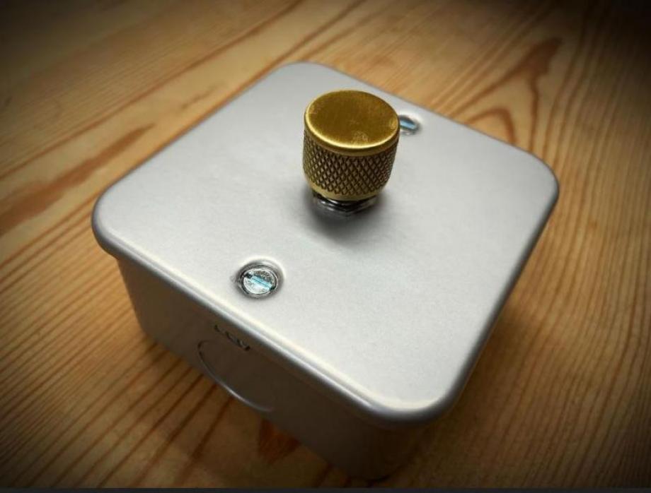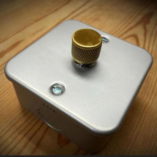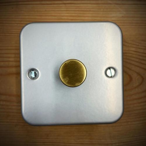 Metal clad 1g LED dimmer with gold etched dimmer knob. Each handmade dimmer comes with a surface metal clad single box and a fitted with a Varilight V-pro trailing edge dimmer. The dimmer is rated from 0-120watts so will dim 10 LED lamps.